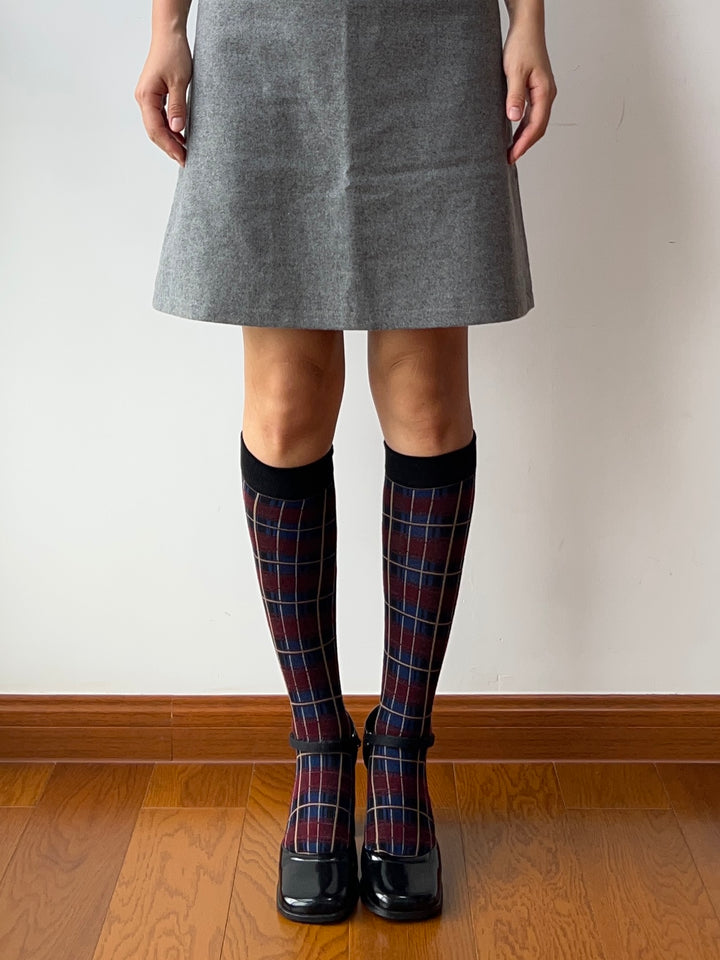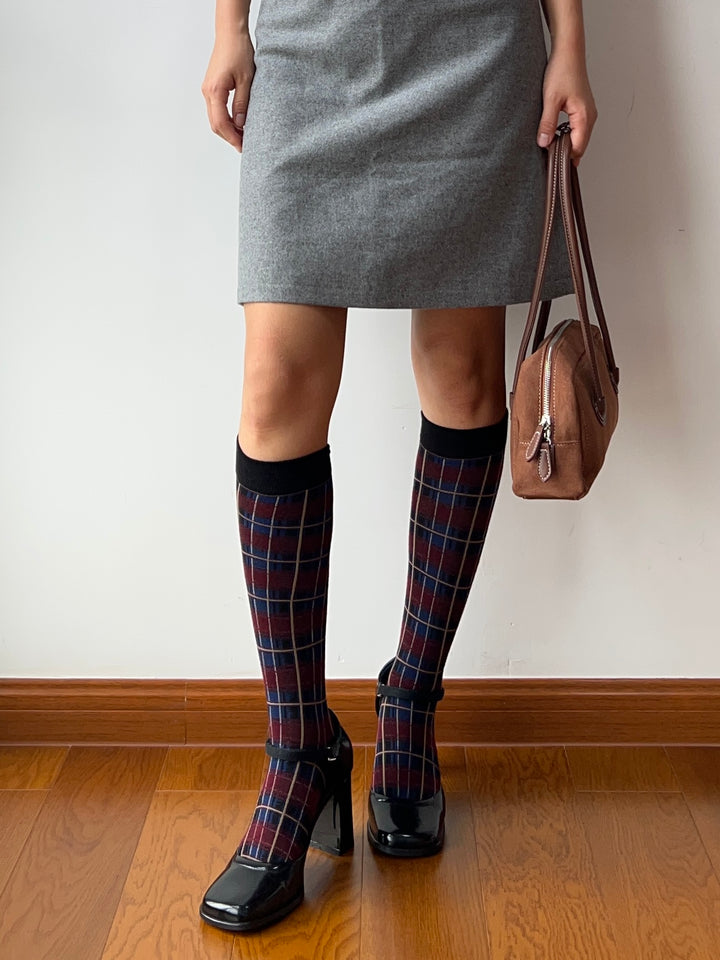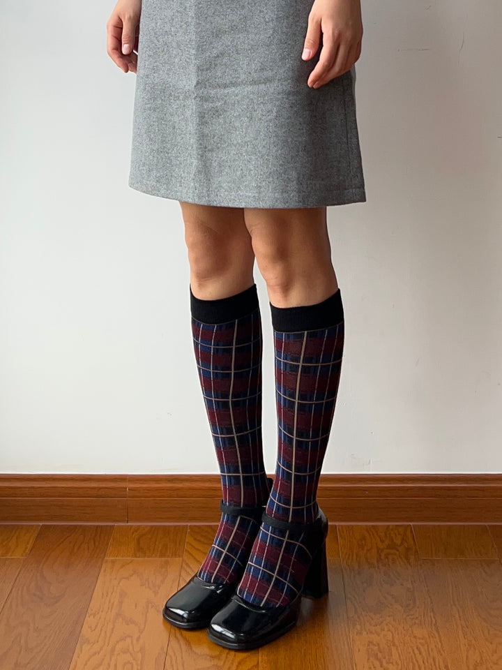 Burgundy Check Pattern Cotton Knee High Socks