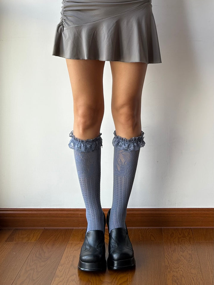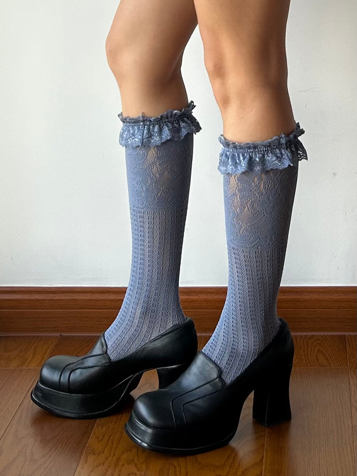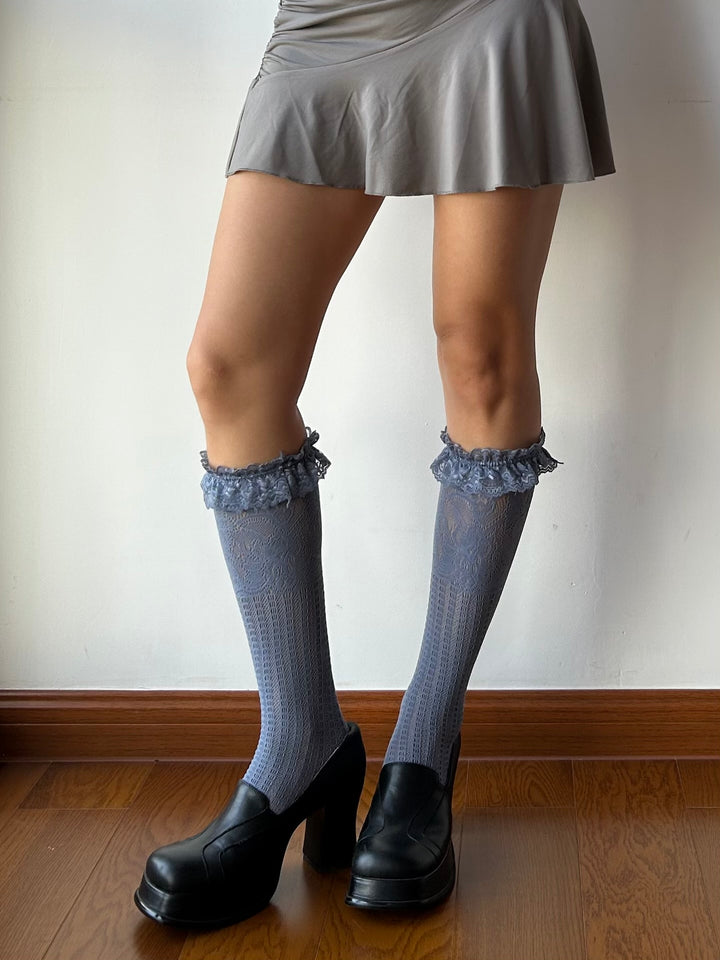 Smoky Blue Ruffle Fishnet Knee High Socks