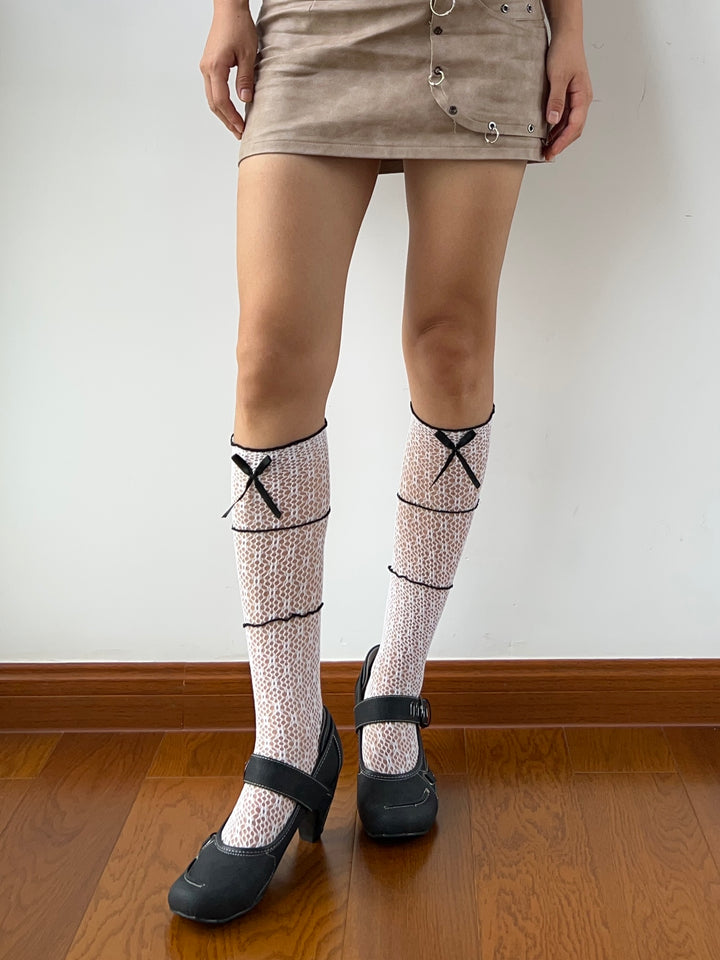 White Trimmed Bow Deco Fishnet Knee High Socks